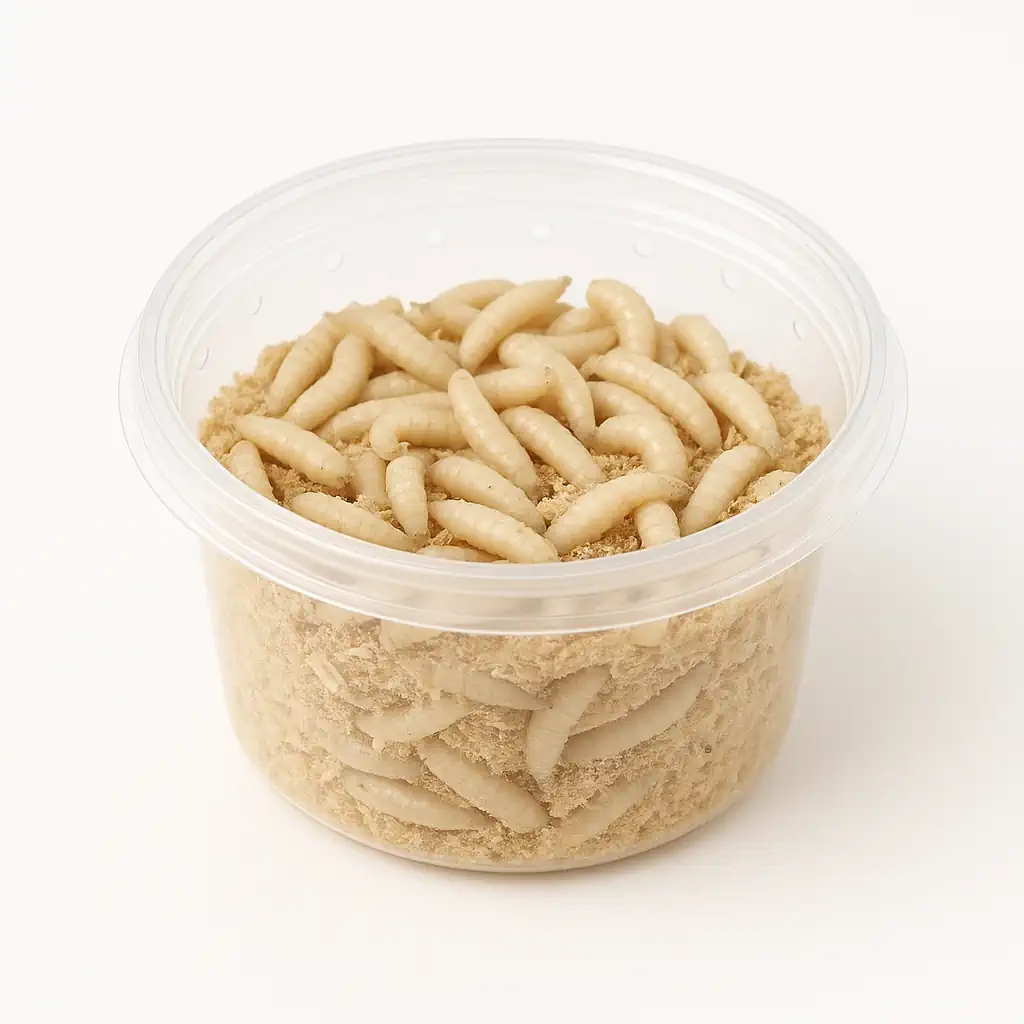 Свежий, активный опарыш. Хранить при +2…+6°C, перед рыбалкой прогреть до комнатной температуры.